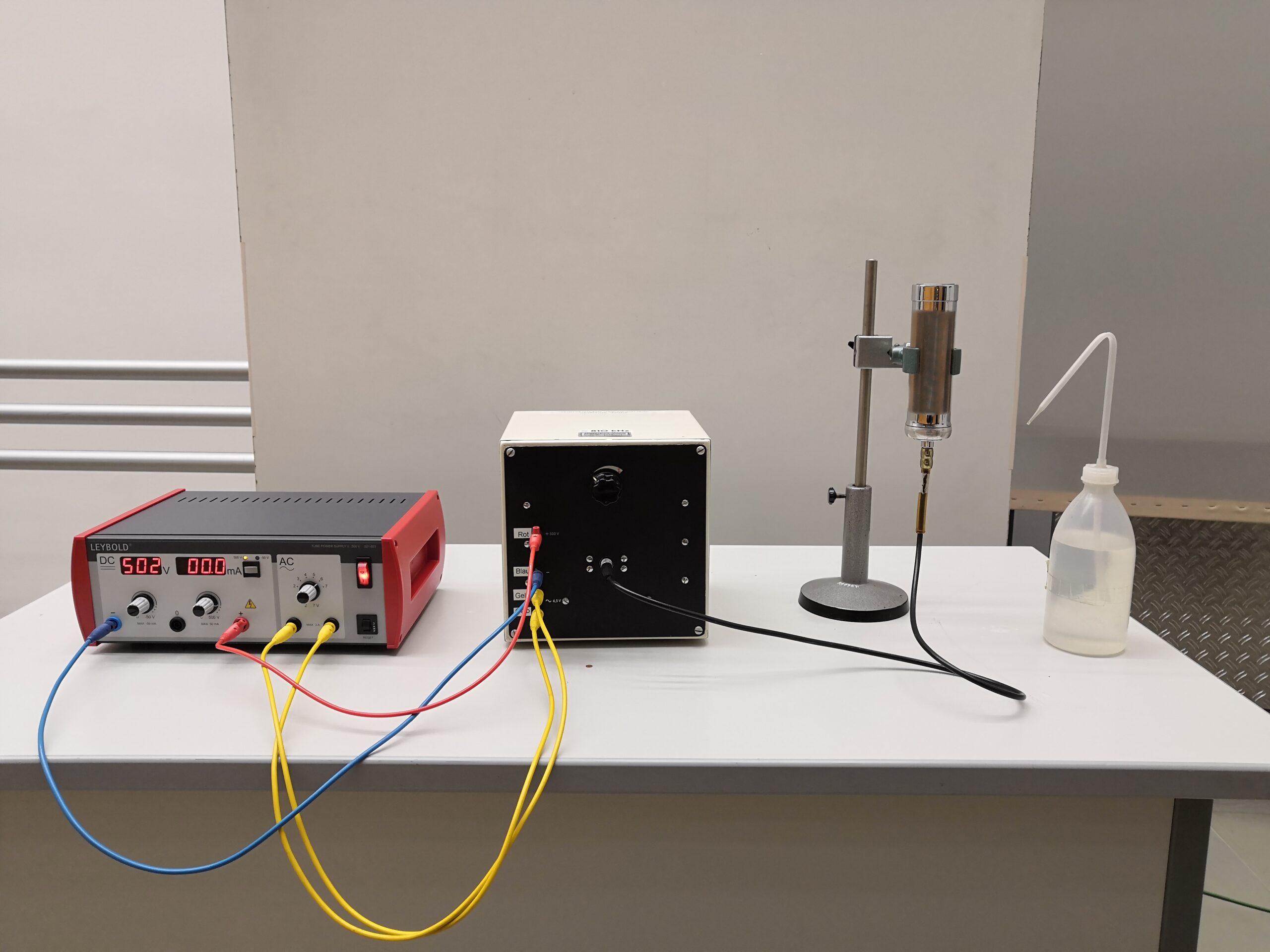 Es existiert ein Ultraschallgeber von zylindrischer Form. Die Stirnseite hat einen Durchmesser von 5cm und schwingt mit 700 kHz. Dieser Aufbau wird mit einer Bogenlampe beleuchtet und mit einer Linse an der Wand abgebildet.